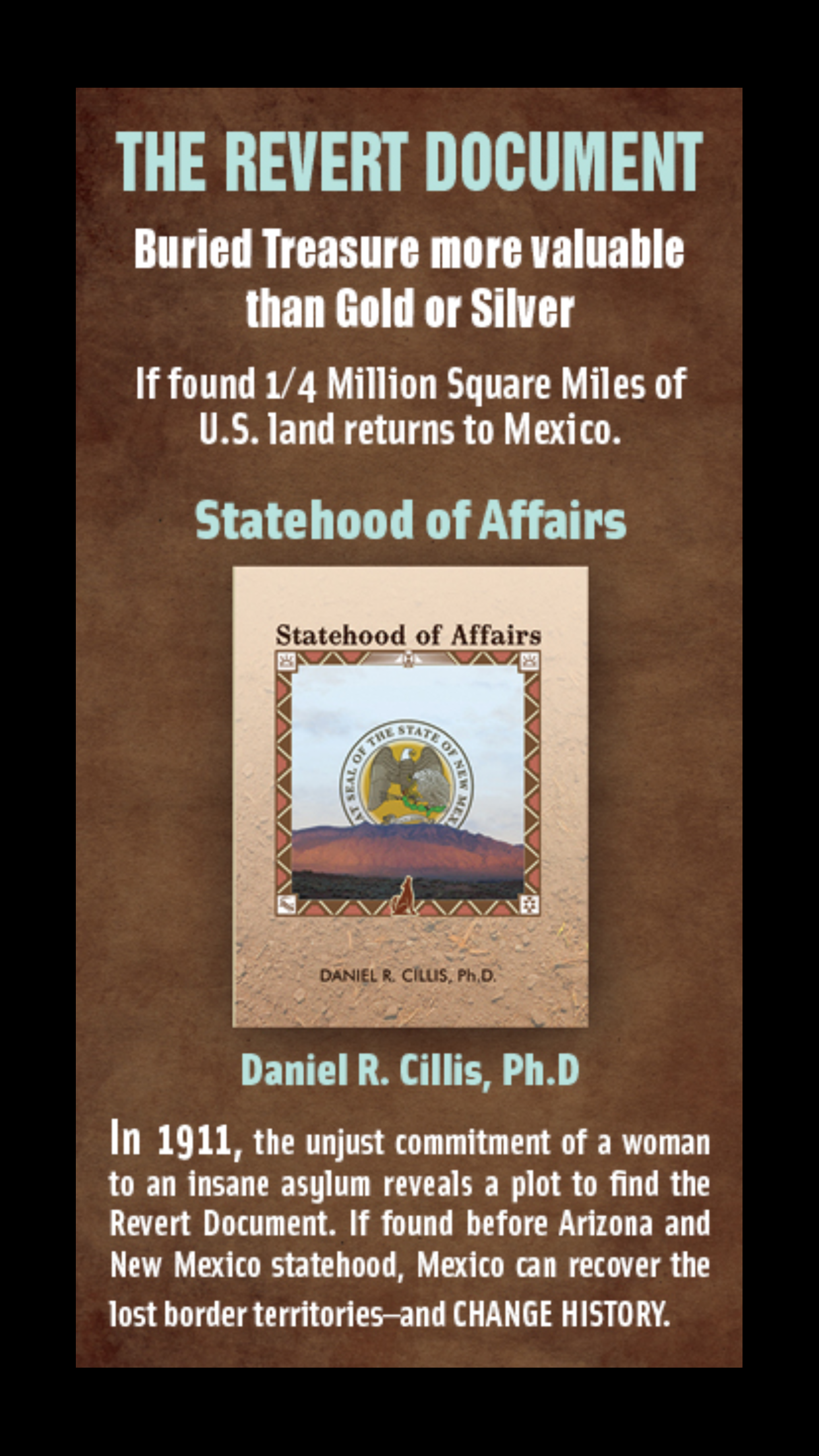 Fun and Insightful — In this fun and insightful work of historical fiction, Statehood of Affairs, Daniel R. Cillis presents readers with an excursion into a hidden history of New Mexico and its long struggle to achieve statehood. By leading the audience through an international plot centered around the mysterious Article X of the Treaty of Mesilla, known as the Revert Document, Cillis crafts a story of romance and revenge, with major significance for New Mexico’s fate in the Union. Embroiled in this plot is Sheriff Adobe Centori of Valtura, who finds that statehood, as well as life and love, are at stake.